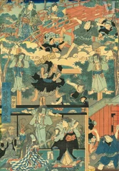 Les artistes d’estampes japonaises comme Hokusai, Hiroshige, ou plus tardivement, Kunichika et Kawase Hasui s’inspirent de la nature, de la mythologie et de la vie quotidienne du Japon. Ces œuvres sont souvent produites en série.