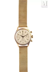 Une montre d'homme ronde chronographe de 35 mm de diamètre environ, adjugée 3 600 euros. Cette montre à mouvement mécanique à remontage manuel se compose d’un boîtier en or rose 750 millièmes, d’un cadran argenté à deux sous compteurs, avec chiffres arabes et aiguilles luminescents ;