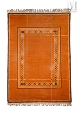 « Tapis modèle 3056 » est un tapis en laine au point noué à décor géométrique de couleur ocre-rouge, brun et beige vendu 30 000 euros ;