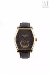 Montre Vacheron Constantin modèle Malte Tourbillon Squelette pour homme. En forme de tonneau, cette montre porte la référence 30130. Produite vers 2015, elle est dotée d’un boîtier en or rose 750 millièmes signé et numéroté 1 322 457. Son cadran anthracite présente des index en or rose et des aiguilles glaives dorées. Son mouvement mécanique à remontage manuel signé, calibre 2795, numéroté porte un poinçon de Genève. Son bracelet en cuir comporte une boucle déployante en or rose 750 millièmes, signée. Cette montre d’exception est adjugée 25 000 euros.