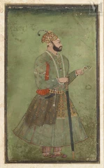 Un portrait de l'empereur Farrukhsiyyar peint à la gouache sur carton rehaussée d'or est vendu 1 400 euros. Le souverain est vêtu d'un jama à semis de fleurs, richement paré de perles et de gemmes. Il s'appuie de la main droite sur son talwar et tient de la main gauche un bijou. À sa ceinture de soie est attaché son khanjar ;