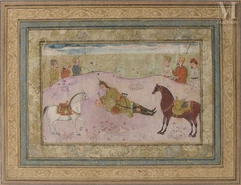 « SCÈNE DE BATAILLE MOGHOLE », une miniature peinte à la gouache avec rehauts d'or sur papier, probablement extraite d'un Shah-Nameh. Montée sur page d'album avec trois marges polychromes, cette peinture représente l'Inde du XVIIIe siècle, avec des dimensions de 6,8 x 10,5 cm pour la miniature et 25 x 23 cm pour la page entière. Elle est adjugée 500 euros