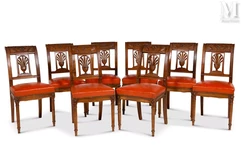 Une suite de quatre fauteuils en bois naturel à dossier trapèze légèrement renversé, adjugée 1 400 euros. Les fauteuils comportent une console d'accotoir sur balustre et angles à décor de macarons, des pieds avants fuselés toupie et sabre à l’arrière.