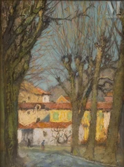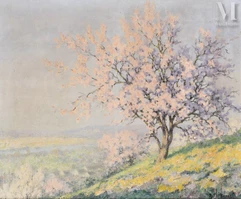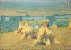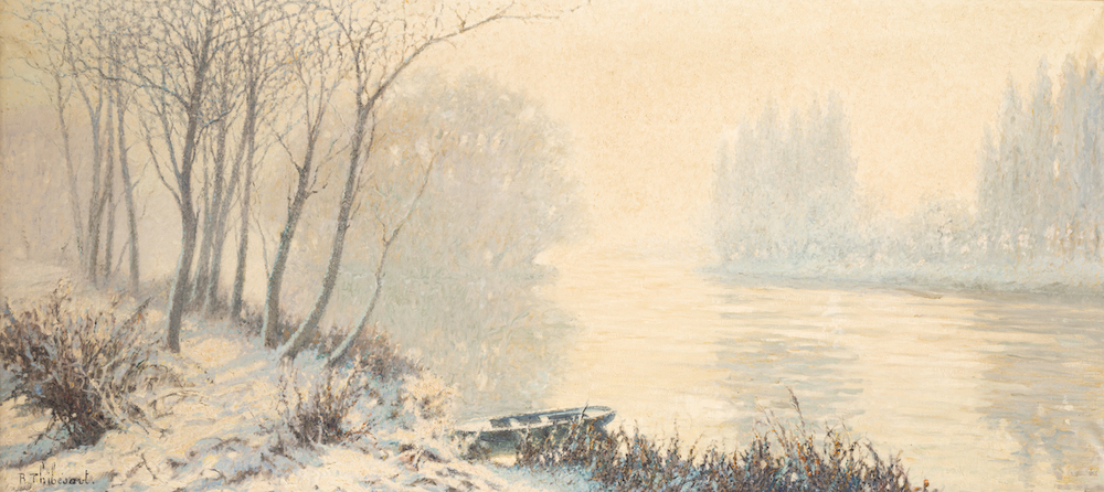 Raymond Thibesart est un artiste peintre français associé au mouvement postimpressionniste et dont le style est souvent qualifié de doux et délicat. Né au sein d’une famille aisée, il montre très tôt une aptitude au dessin et commence à suivre l’enseignement d’Emile Boggio, peintre impressionniste vénézuélien, dès l’âge de onze ans. Il entre à l’Ecole des Beaux-Arts en 1894, puis à l’Académie Julian où il s’inspire des tableaux impressionnistes et pointillistes et d’où sont sortis plusieurs artistes fondateurs du mouvement Nabis. En 1897, Raymond Thibesart devient médaillé de la Société des Artistes Français et expose ensuite régulièrement au Salon d’Automne et au Salon des Indépendants. C’est au tournant du XXe siècle, et en particulier à la suite de son voyage en Italie avec Emile Boggio, que Raymond Thibesart se tourne de plus en plus vers le post-impressionnisme. Ce dernier capte ainsi les paysages qu’il sillonne avec toute la spontanéité d’un travail sur le motif et les couleurs, comme en Suisse, en Belgique, en Corse etc. Raymond Thibesart développe alors un langage pictural tout à fait personnel dont nous retiendront une utilisation maîtrisée de la lumière et de la couleur, capturant les effets changeants du soleil sur les paysages, sur les arbres, les fleurs, meules de foin etc. Ses œuvres témoignent d’une observation minutieuse de l’atmosphère qui se dégage de chaque élément de la nature. Thibesart dépeint avec finesse la lumière froide de l’hiver ou encore la vitalité du vert printanier. Doté d’une grande sensibilité, il parvient à saisir la beauté éphémère qui se tient face à lui et la retranscrit sur sa toile avec poésie et sérénité. En somme, ses peintures de paysages sont de réelles odes à la nature et à la lumière, invitant le spectateur à la contemplation voire à se laisser gagner par la rêverie.