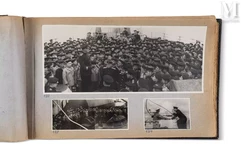 - Un album de voyage, adjugé à 2 000 euros, regroupant une collection de souvenirs datant de la Seconde Guerre mondiale, vers 1945. Formé d'environ 80 pages, il rassemble 494 tirages photographiques, tous numérotés et certains annotés, offrant un aperçu détaillé de la vie à bord du cuirassé Arkhangelsk lors de son voyage en Angleterre. Les photographies, en noir et blanc, documentent divers aspects de la vie militaire et maritime de l'époque ;