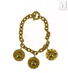 - Un lot de bijoux en or jaune 18K est adjugé 2 620 euros : colliers, bracelets, gourmettes, chaînes giletières et diverses pièces décoratives, comme un pendentif à décor de roses. Le poids brut total des bijoux est de 95,3 g ;