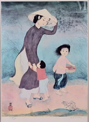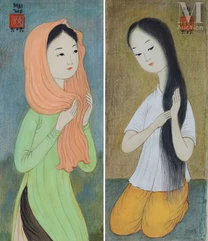 - Femme à l'éventail, une création de Mai Trung Thu réalisée en 1954 : cette composition exécutée à l'encre et aux couleurs sur soie marouflée sur papier bristol est signée et datée par l'artiste. Elle est présentée dans son cadre d'origine, conçu par l’artiste lui-même. Les dimensions avec le cadre sont de 31 centimètres de hauteur et 20 centimètres de largeur. Elle est adjugée 33 000 euros ;