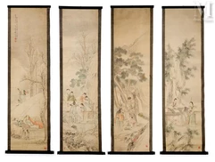 - un ensemble de quatre peintures chinoises du XXe siècle, exécutées à l'encre et couleurs sur papier, est vendu 8 000 euros. Ces œuvres, montées sur rouleaux, captivent par leur représentation exceptionnelle des quatre saisons. Chaque rouleau, mesurant 162 x 47,5 cm, porte la signature de Yang Yingxuan, accompagnée de cachets et d'une inscription placée en haut à gauche, témoignant de l'habileté et de la sensibilité de l'artiste à retranscrire la poésie des cycles de la nature ;