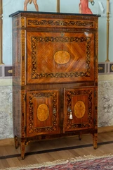 - Un secrétaire de forme rectangulaire d'époque Louis XV, adjugé 20 000 euros. Il est fabriqué en bois de rose et bronze doré, en laque européenne or à fond rouge et coiffé d’une brèche d’Alep cerné d’un bec de corbin. Il est également décoré de chinoiserie et de personnages dans des paysages lacustres ;