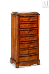 - Un secrétaire de forme rectangulaire d’époque Restauration est adjugé 5 800 euros. Il est en placage de loupe d'amboine dans des encadrements de filets d'amarante et couronné par un fronton formé d’enroulements. Le secrétaire est aussi garni d'un cuir rouge doré aux petits fers, l'abattant dévoilant quatre tiroirs superposés ;