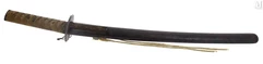 - Japon, XIXe siècle, un tanto est vendu 600 euros. Le fourreau saya est en laque nashiji bleutée, avec un sageo tressé en soie claire. Le manche est recouvert d’un tressage hineri maki en soie, sur un fond de galuchat blanc. Il se termine par un fushi kashira en bronze et or, décoré d'un paysage nuageux sur chaque face. Un menuki représentant un artisan orne le manche. Le tsuba, de forme mokko-gata, est en bronze et ornée d'un riche décor de rinceaux. La lame fine est légèrement incurvée. L'ensemble comprend un kokuza, dont le manche est décoré d'un paysage avec oiseaux, chaumière et végétation.