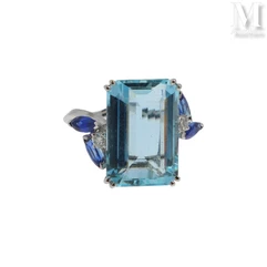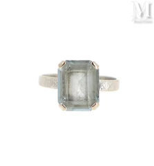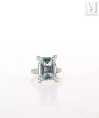 Une bague en or gris ornée d'une aigue-marine de taille émeraude, environ 4 carats, entourée de petits diamants, avec un poids brut de 5,6 g est par exemple estimée entre 400 et 600 euros.