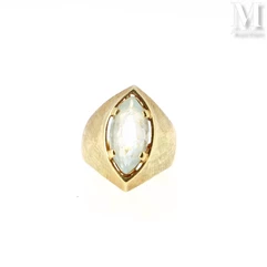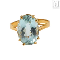 Une imposante bague en or jaune 18 carats sertie d'une aigue-marine de 35 carats, taille émeraude est vendue 4 000 euros. Il s'agit d'un superbe bijou fabriqué à la main en Italie vers 1940.