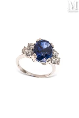 - Une bague en or gris ornée d'un sublime saphir de couleur « bleu royal » de 6,41 carats, taillé en émeraude est adjugée 55 000 euros. Le saphir est encadré de quatre diamants baguettes disposés en dégradé. Le saphir est accompagné d'un certificat suisse (Gubelin) qui précise ses caractéristiques : origine des gisements de Birmanie, absence de traitement thermique, et mention spéciale « vivid blue » (bleu royal). Ce saphir est exceptionnellement limpide en cristallisation. Les saphirs de cette qualité sont extrêmement rares. La bague correspond à une taille de doigt de 52 et pèse 5,8 grammes.
