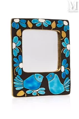 — Une autre boîte signée Mithé Espelt, de forme rectangulaire, réalisée en bois laqué noir trouve preneur pour 550 euros. Son couvercle est en faïence émaillée bleu nuancé et doré, avec un effet craquelé. Cette boîte possède des dimensions de 6,5 x 17 x 10 cm.