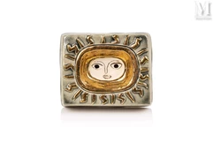 — Sylvia Stave, figure suédoise du design, conçoit une boîte à bijoux en 1934, remarquable par sa sobriété et son élégance. Réalisée en étain, elle est ornée d'un bouton rond décoré d’un visage féminin stylisé. L’intérieur, tapissé de velours vert bouteille, ajoute une touche de raffinement. Estampillée « Garanterat Svenskt Tenn » sous la base, cette boîte de 5 cm de hauteur et 14,5 cm de diamètre est adjugée 600 euros ;