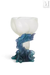 Un vase en forme de calice nommé « Papillon », produit entre 1912 et 1914 en seulement 6 exemplaires, est vendu 19 000 euros. La pâte de verre translucide de la partie supérieure évasée est ornée de papillons de nuit violets et violines, évoquant des femelles bombyx. Des motifs en relief, représentant des œufs et des coulées vert clair, enrichissent ce décor naturaliste et poétique. Avec une hauteur de 12,8 cm et un diamètre de 12,2 cm, cette pièce rare est signée sur la partie basse ;