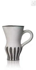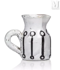- Un pichet en faïence émaillée blanche d'une hauteur de 31,5 centimètres, caractérisé par une double ouverture, est adjugé 2 100 euros. Son décor émaillé représente un oiseau portant un cep de vigne, un motif typique du style raffiné et graphique de Roger Capron ;