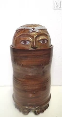 - Une sculpture en céramique haute de 34 centimètres, signée Cloutier, est vendue au marteau 3 000 euros. Elle représente une tête d'homme barbu, avec une couverte émaillée verte et brune. Une partie du visage s'ouvre sur un compartiment dévoilant des porte-pipes ;