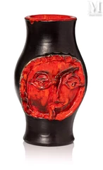 - Un vase en céramique de Robert et Jean Cloutier, d’une hauteur de 30 centimètres, est adjugé 1 200 euros. Arborant une couverte noire mate et rouge vernissée, il présente un visage stylisé. La signature Cloutier R J est apposée sous la base ;