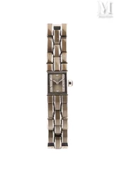Bracelet en or gris 18k (750 millièmes) formé de 5 maillons rectangulaires à décor ajouré et géométrique, sertis de diamants taille ancienne et en rose, dont une ligne centrale de diamants plus importants en serti clos. Trace de poinçon de maître de Joseph Chaumet. Poids brut : 48,9 g. Long. : 18,3 cm
