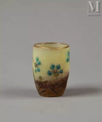 un vase en verre multicouche légèrement opalescent, à col polylobé à chaud est vendu 15 000 euros. Son décor est finement dégagé de graminées et de primevères sur un fond