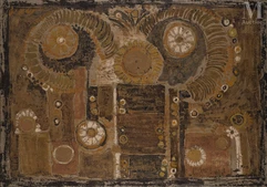 De retour au Maroc en août 1961, il traverse une période d’introspection artistique. Fasciné par les tatouages berbères, les motifs des poteries et les symboles populaires, il se détourne du figuratif pour créer un vocabulaire plastique personnel. Ce langage, fait de formes simples, de couleurs terreuses et de signes abstraits, devient la marque de son œuvre.