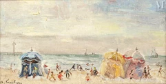 Né à Paris, André Hambourg acquiert une maison en Normandie puis une seconde à Saint-Rémy-de-Provence et fait de ses régions ses thèmes de prédilection. Les plages normandes occupent une place centrale dans les tableaux d’André Hambourg. De Deauville à Honfleur en passant par Trouville, il anime le paysage avec les hommes, femmes et enfants venus se divertir face à la mer.