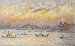André HAMBOURG (1909-1999), Sur le Bosphore, le soir, huile sur toile, 22 x 35 cm, signé et daté en bas à droite “A.Hambourg 66”, contresigné, titré et daté au dos sur la toile “a.h Sur le Bosphore, le Soir sur le Colbert Décembre 1969”. Adjugé 4.200 euros.