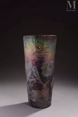 Clément MASSIER (1844 - 1917) et James et VIBERT (1872 - 1942) "Morphée" Exceptionnelle sculpture en céramique, figurant un homme au corps dénudé émergeant des plis amples du drapé d'une femme aux ailes d'ange, qui semble l'attirer vers elle. Ses ailes et sa tête soutiennent une coupe ovoïde à ouverture concave. Superbe couverte émaillée irisée vert-turquoise, violine et violet-parme à reflets métalliques intenses. Signé en creux sous la base "C.M" et date 1901, et en pourtour du socle émaillée "C.M Golf Juan (A.M)" 49 x 15,3 x 16 cm Provenance : vente succession Sarah Bernhardt, juin 1923. Bibliographie: "Les Massier, côté cour, côté jardin", Catalogue d'exposition du Musée Magnelli, Musée de la céramique de Vallauris, Edition Silvana, 2009, modèle variant reproduit page 28. « Morpheus » adjugé 9 000 euros chez MILLON.