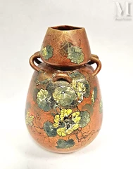 Clément MASSIER (1844-1917) Rare et important cache-pot en céramique à décor couvrant de serpents enlacés sur fond de végétation, à belle couverte iridescente aux émaux lustrés et flammés. Signé "M. Clément Massier Golf Juan (A-M)", "MCM" en creux et porte un numéro "2" en creux sous couverte. H : 30 cm, D : 38 cm (percé et restaurations) adjugé 11 000 euros chez MILLON.