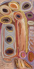 Corban Clause Williams est un artiste Manyjilyjarra de la région de Pilbara. Son travail s’inspire du temps qu’il a passé dans le pays de Kaalpa, un point d’eau dans le désert associé au Temps du Rêve. Kaalpa, sur la Canning Stock Route, est le ngurra (pays) de ses deux grands-pères, qui ont maintenu un mode de vie traditionnel dans la région. En attachant un pinceau à un long poteau et en se déplaçant sur la toile, il a pu expérimenter des lignes plus lâches, développant une tension avec son travail de points plus précis. Il dit de son travail : « Kaalpa est le pays de mon grand-père. J’étais vraiment heureux d’aller voir le pays de mon grand-père – pukurlpa (heureux). Quand je peins, j’ai l’impression d’être chez moi. En le faisant sur la toile, j’ai l’impression d’être là, chez moi. »