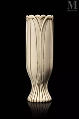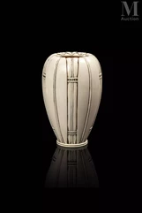 On relèvera à titre d’exemple celles qui ornent l’ensemble mobilier « Chambre de Jeune Fille » présenté en 1924 dans la galerie de l’artiste parisien. Les œuvres autonomes d’Eugénie O’Kin sont de cette période d’après l’Asie, en ivoire et où la sensibilité de l’artiste s’exprime pleinement dans le délicat panel de fleurs et de plantes stylisées qu’elle développe alors. Ces réalisations poétiques et raffinées disparaissent progressivement au profit du concours à celles de son époux. Pour autant ces œuvres de collaboration sont d’un aboutissement rare, les céramiques de Simmen se trouvant couronnées par des accessoires qui viennent les sublimer : les bouchons ou couvercles réalisés par O’Kin. Car chez O’kin et ainsi que le théorisa l’historien de l’art nippon Tsuji Nobuo, il y a un rapport poétique à l’objet qui « délivre le cœur humain de son asservissement à la vie ordinaire et offre à l’usager, quel que soit son statut social, l’expérience d’une joie spirituelle »[4].
