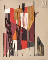 Née en 1922 à Ecouen et décédée en 2005 à Paris, Huguette Arthur-Bertrand est une peintre française liée à l’abstraction lyrique. Elle participe dès 1949 au groupe « Les Mains Eblouies » exposé par la Galerie Maeght, et réalise ses premières expositions personnelles dès 1950. Ses œuvres sont abstraites, et ses compositions sont principalement construites comme des ensembles de masses colorées, de lignes et de faisceaux, accompagnés d’une palette composée de bruns, de rouges, et d’orangés. L’artiste, bien qu’appartenant à l’abstraction lyrique, ne se laisse pas beaucoup influencer par ses contemporains, et développe sa propre signature picturale, qui évolue lentement des années 1950 à 2000. Les œuvres d’Huguette Arthur-Bertrand figurent dans les collections permanentes d’institutions telles que le Centre Pompidou, le Musée National des Beaux-Arts du Québec, et le Walker Art Center à Minneapolis.