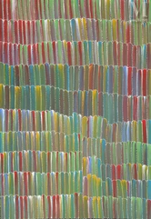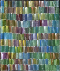 On observe une héritage formel du travail sur batik, pratiqué à Utopia auparavant : gradient de couleurs, voiles de teintes sous-jacentes visibles, stratification de couches.