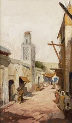 Peintre espagnol, José Cruz-Herrera est le descendant du peintre andalou du XVIIème siècle Francisco Herrera le Vieux. Il suit un enseignement artistique à Séville et à Madrid, puis visite Paris et la Belgique. Après sa première exposition à Madrid en 1915, il part pour l’Amérique du Sud. Il séjourne à Monte-Video, Buenos Aires où il est très apprécié pour ses portraits. De retour en Europe, il expose à Venise, Londres, Paris ainsi qu’en Espagne et reçoit plusieurs médailles. Il découvre le Maroc au cours d’un bref séjour puis, fasciné par ce pays, décide de s’y installer définitivement en 1923, à Casablanca. La ville connaît alors un rapide essor et les collectionneurs sont avides d’acheter des peintures pour agrémenter leurs nouvelles demeures. Jules-Henri Derche, créateur de meubles et décorateur, est l’un des principaux artisans de la vague de prospérité artistique. Il expose les œuvres de Cruz-Herrera dans sa galerie et ce dernier s’y façonne une réputation durable. Il sera ainsi exposé, pendant plus de trente ans, dans plusieurs galeries de Casablanca ainsi qu’au Salon Artistique de l’Afrique Française.