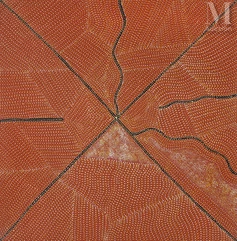 Le public français connaît bien Kathleen grâce aux acquisitions récentes du Musée des Confluences (Lyon) et celles du Musée du Quai Branly (Paris). Elle est très vite considérée comme l’une des artistes les plus importantes du désert. La toile, structurée autour de diagonales qui la partage, raconte le voyage des Ancêtres au Temps du Rêve, la création des sites sacrés. Plus exactement le voyage des Ancêtres, Lézard Diabolique des Montagnes, surtout celui des femmes : comment elles cherchèrent l’eau, la nourriture, les lieux de campements. Bien que toute la famille Petyarre, dont Kathleen et Gloria sont les membres les plus éminents, partage le même thème, chacune des initiées en donne une lecture personnelle. Les couleurs rappellent la capacité de l’animal, le lézard, à se camoufler. La palette change au gré des saisons mais aussi des envies de l’artiste, des juxtapositions de couleurs qu’elle souhaite expérimenter.