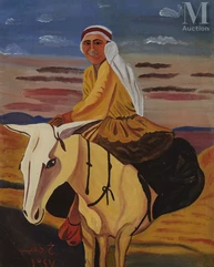 Plus que de simples portraits, ses peintures sont des interprétations personnelles des objets et des points de vue les plus quotidiens, qu'il s'agisse de fermiers récoltant du blé dans "Sans titre" (1960) ou de scènes de loisirs bucoliques dans "Récréation de bédouins" (1950). L'œuvre de Zghaib se caractérise toujours par des lignes détaillées, des couleurs vives et un univers poétique malgré la simplicité aplatie de ses formes.