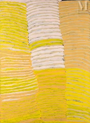 Makinti, l’une des matriarche pintupi, est née vers 1930 dans la région du lac McDonald. Elle peint essentiellement des épisodes du Temps du Rêve mettant en scène les 2 Femmes Ancêtres (Kungka Kutjarra – et plus particulièrement Makinti s’inspire des motifs associés au site de Lupulnga). Ces œuvres sont rythmées par de grandes vagues prenant l’aspect de lignes légèrement incurvées (symbolisant les jupes cérémonielles en corde de cheveux qui servent pour certains rites) ou d’ovales qui viennent parfois s’assembler pour former comme un mur de cellules; parfois les deux motifs sont présents sur ses compositions; et toujours avec une grande harmonie des tons où dominent le plus souvent les ocres, les oranges et le rose avec un emploi des mauves surtout dans les œuvres récentes. Alors que les hommes sont restés fidèles à un style très minutieux, Makinti peint avec une grande spontanéité, une grande vigueur que même ses problèmes de vue ne freinent pas. L’aspect des œuvres de Makinti, semblant sculpté par ses doigts, est comme un écho, une réminiscence des actions des Ancêtres du Temps du Rêve façonnant le vaste désert par leurs actions. Collections : AGNSW, MAGNT, NGV, QAG