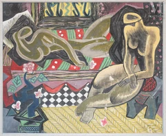 d’émotions.L’œuvre porte l’empreinte forte du cubisme, où les formes sont déconstruites tout en préservant l’essence des personnages. Bien que les figures féminines ne soient pas représentées de manière réaliste, les aplats de couleurs, les contours épais et les lignes ciselées traduis en...