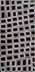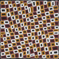 Walala représente principalement les lieux sacrés et les trajets rituels de ses ancêtres, en lien avec le Tingari Dreaming, un ensemble de récits réservés aux hommes initiés. Il traduit ces itinéraires spirituels en une cartographie symbolique épurée, traversée par une tension entre ordre et vibration.