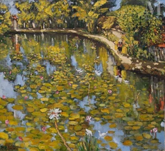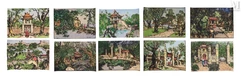 Reconnu pour ses œuvres sur laque, Do Xuan Doan a également rencontré un succès similaire avec la peinture à l'huile. La série exceptionnelle de 10 peintures sur bois présentée dans le catalogue représente un ensemble rare de l'artiste. Ces œuvres captivent les splendeurs de la capitale millénaire à travers les images de dix temples et pagodes vénérables. La manière distinctive de peindre de Do Xuan Doan et sa palette de couleurs audacieuses confèrent une exclusivité à son art.