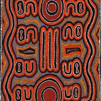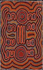 Kitty Napanangka Simon (née en 1948) est une femme Warlpiri de Lajamanu, à la lisière nord du désert de Tanami. Elle est l’une des gardiennes principales du site de Mina Mina. Elle démarre sa carrière à la fin des années 1980 mais elle peint peu, cesse de peindre sur de longues périodes. Elle 2008 elle s’y met plus sérieusement. Il faut encore attendre quelques années pour qu’un style personnel, fluide, contemporain dans l’aspect voit le jour. Ça tombe plutôt bien, c’est une période où les artistes de Lajamanu sont oubliés par le marché. Les expositions à Sydney mais aussi à New York s’enchainent. Cependant elle a depuis peu des soucis de santé l’obligeant à mettre un frein à sa carrière.