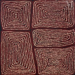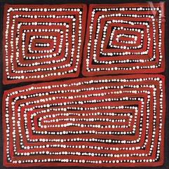 Ses compositions reposent sur un vocabulaire géométrique épuré : lignes parallèles, trames régulières, cercles concentriques et réseaux de points qui symbolisent les pistes du Dreaming, les points d’eau et les traces spirituelles du territoire. Ces structures traduisent une cartographie intime du désert, à la fois physique et spirituelle.