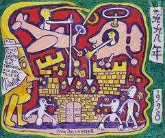 Né en 1926 à Paris, Yvon Taillandier est peintre, sculpteur et écrivain français. Il est connu pour son œuvre figurative. Il s’installe à Paris après la Seconde Guerre mondiale, il y rencontre Giacometti, Soulages, mais aussi Miro. En 1947 il est nommé secrétaire du comité du Salon de mai par Gaston Diehl. L’œuvre d’Yvon Taillandier est multicolore, elle évolue dans un monde imaginaire intitulé le « Taillandier Land ». Il décrit lui-même son travail ainsi « mes tableaux se veulent des chants joyeux, voire des hymnes à la joie ».